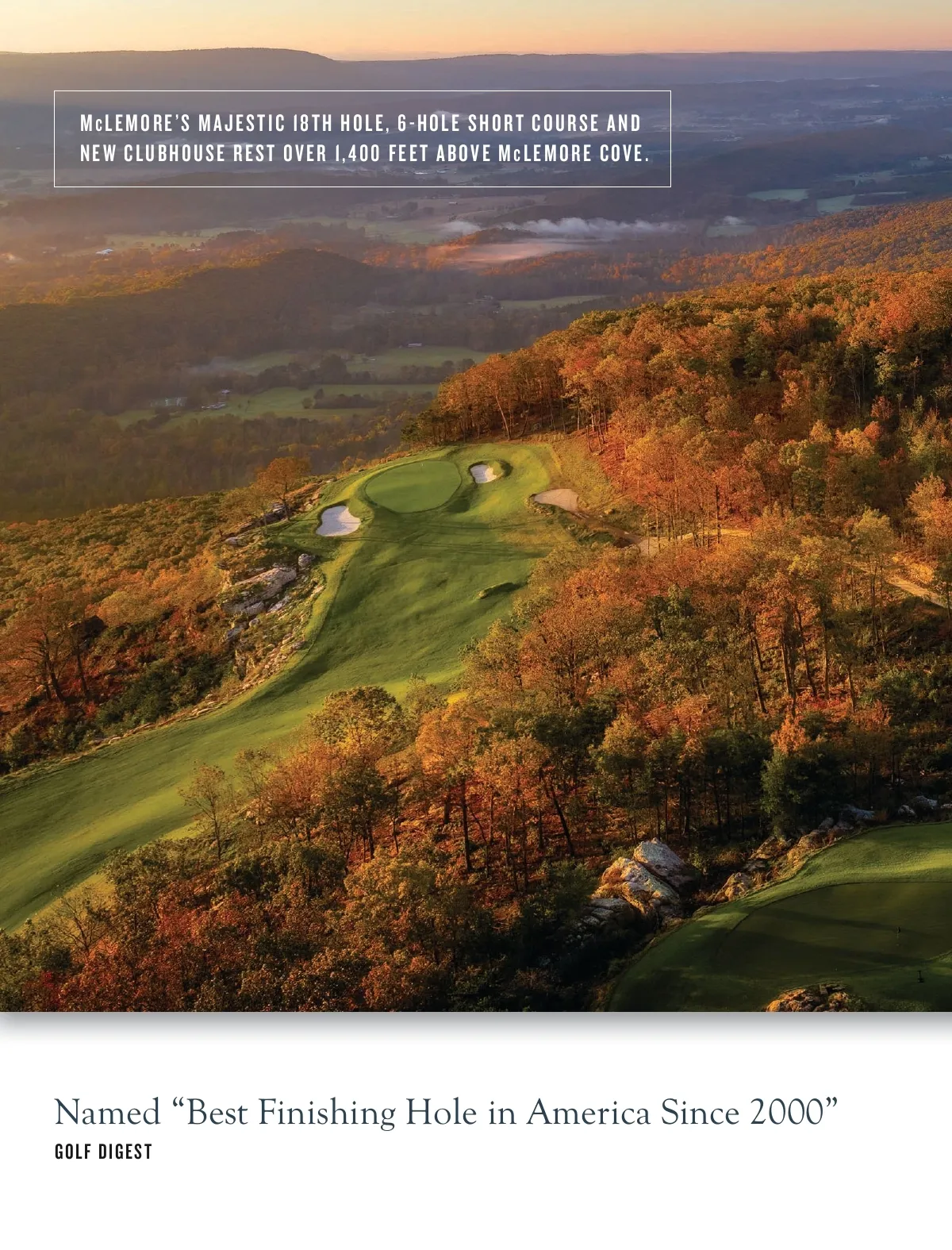 M cLEMORE’S MAJESTIC 18TH HOLE, 6-HOLE SHORT COURSE AND NEW CLUBHOUSE REST OVER 1,400 FEET ABOVE McLEMORE COVE. Named “Best Finishing Hole in America Since 2000” GOLF DIGEST
